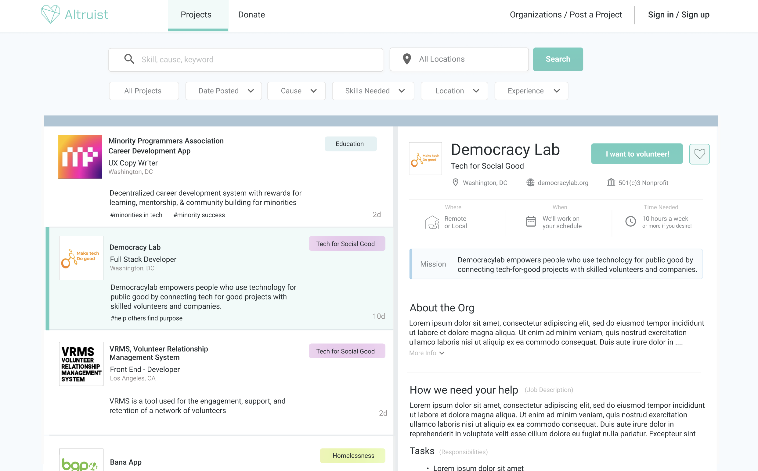 In this project, I redesigned the search results for a volunteer opportunities platform. The goal of the platform is to connect volunteers to tech projects that benefit the greater good. Thus the search results connect the user to non-profits, projects/ companies that they can volunteer for! I created this alternative design in Figma. The goal is to allow users to quickly browse through volunteer opportunities.